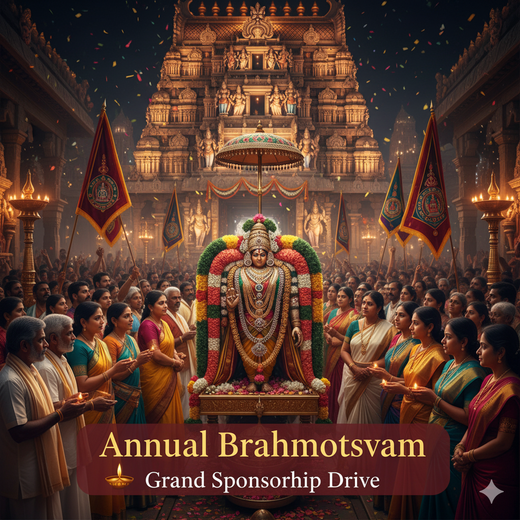 Support the temple's most significant annual festival, the Brahmotsavam. Your generous sponsorship helps cover the extensive arrangements, including decorations, special pujas, cultural performances, and Prasad distribution, ensuring a spiritually enriching experience for all devotees. Funds will contribute to making this year's Brahmotsavam a truly divine celebration.